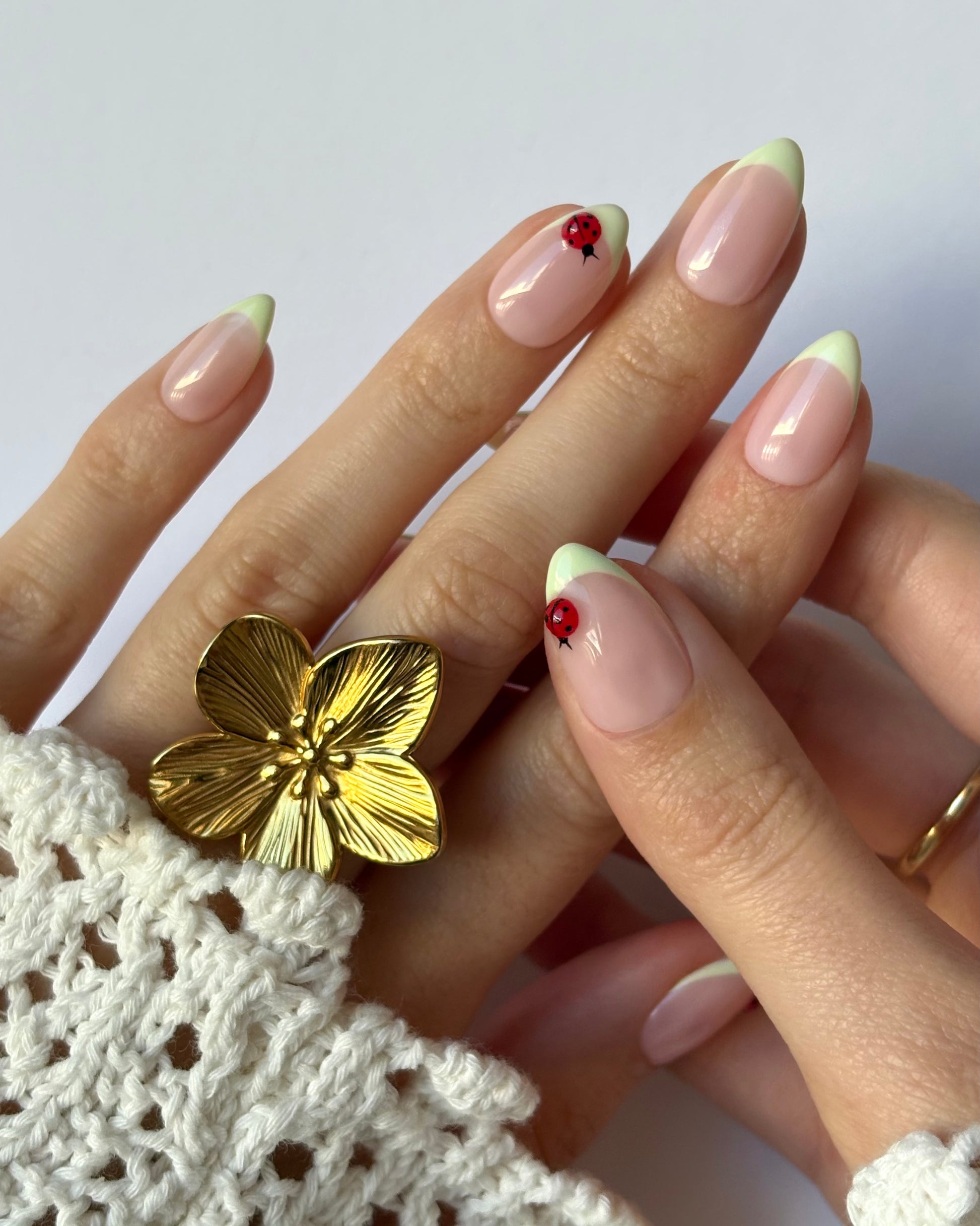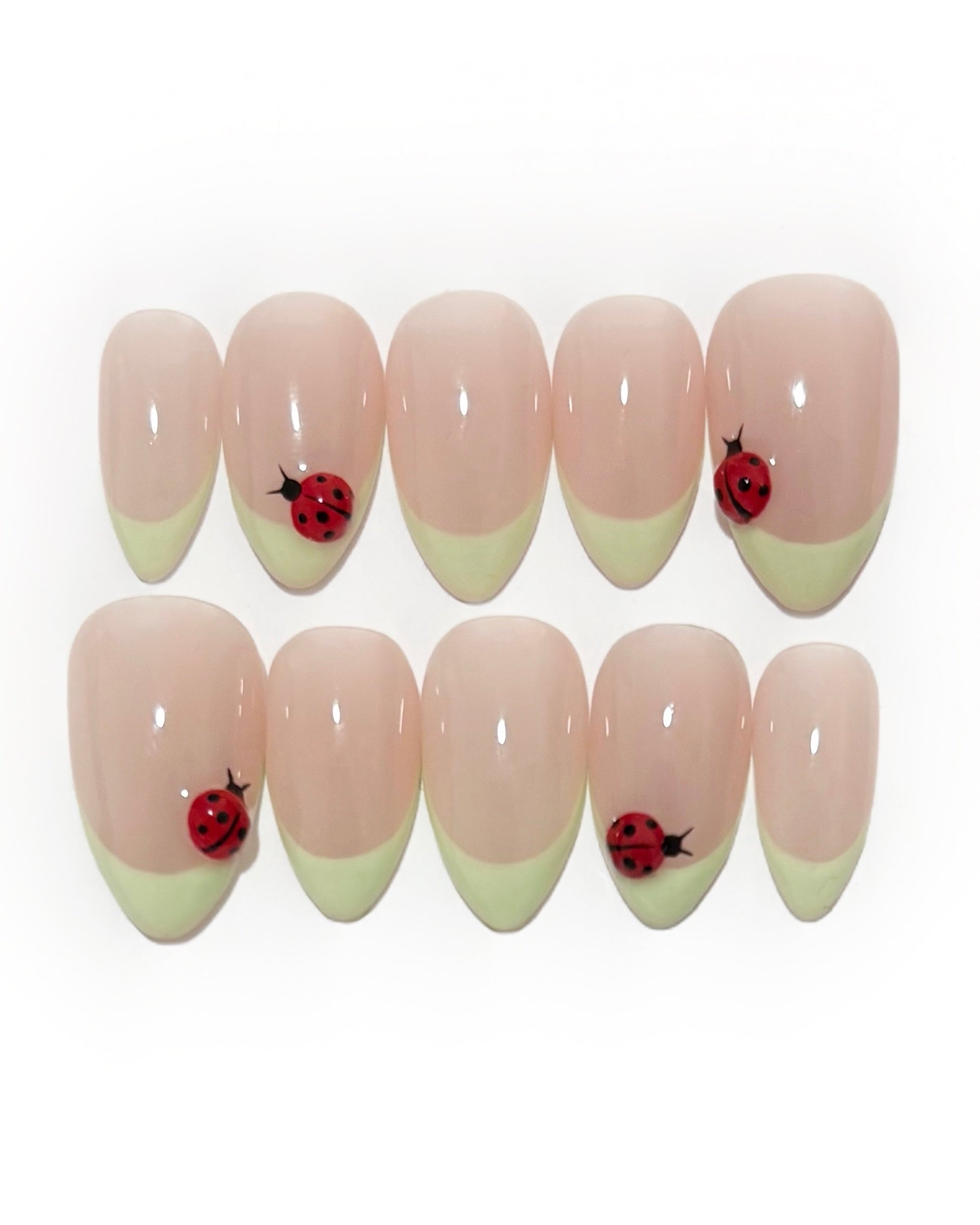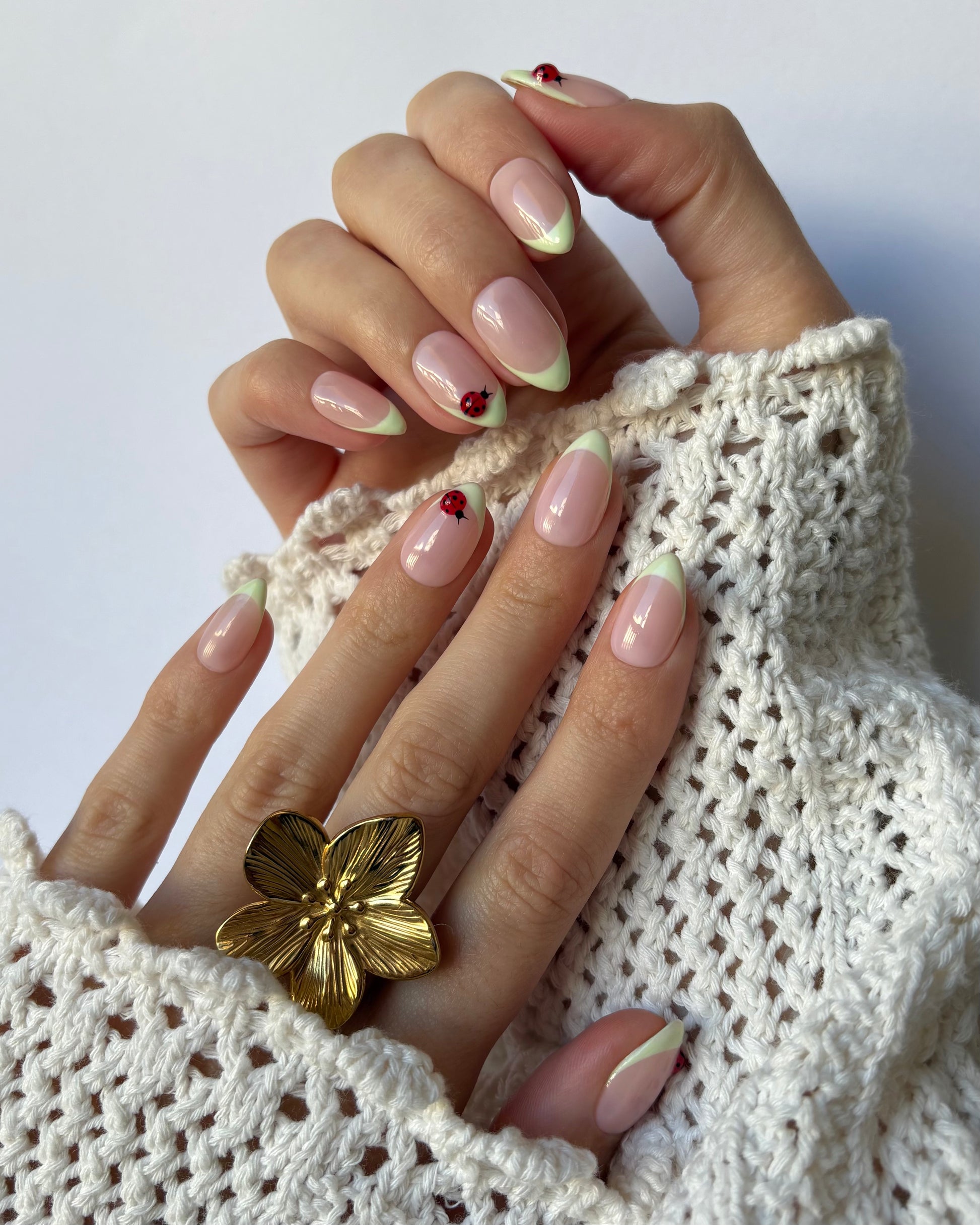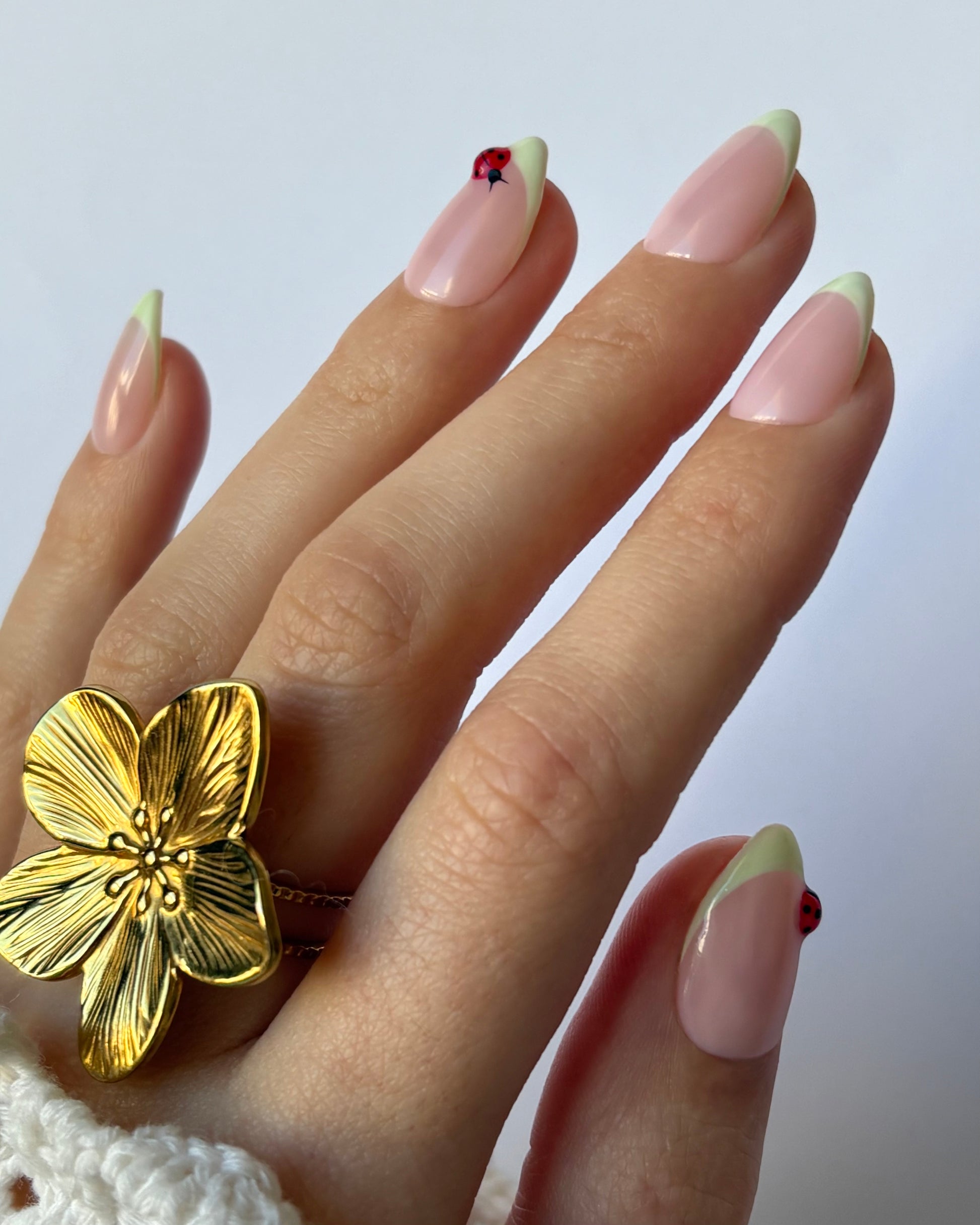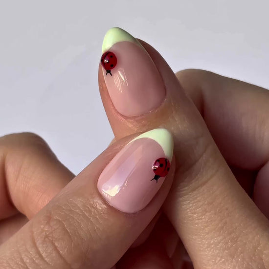 Un diseño que se siente como un paseo por la primavera. La francesa suave y el pequeño detalle de mariquita le dan ese toque divertido que te recuerda a flores, sol y días tranquilos al aire libre.