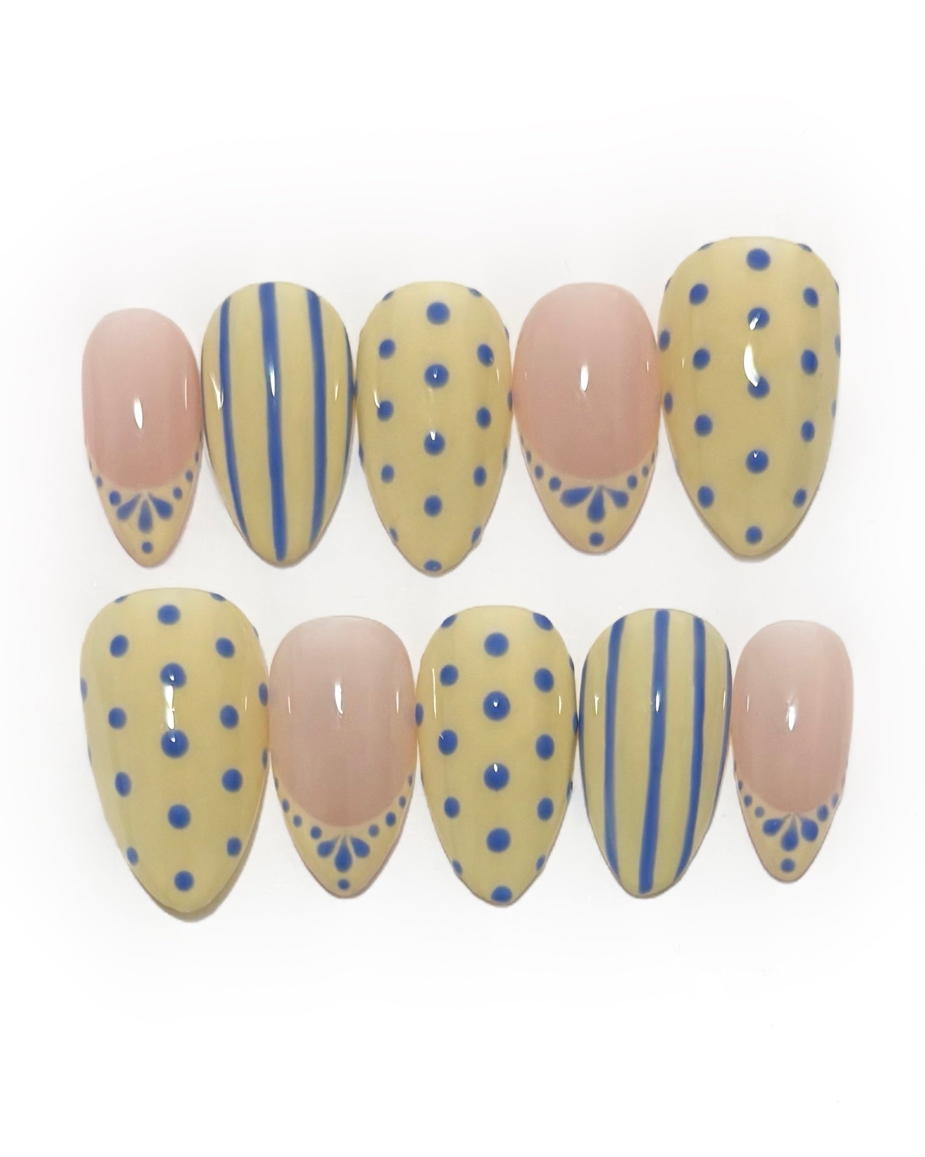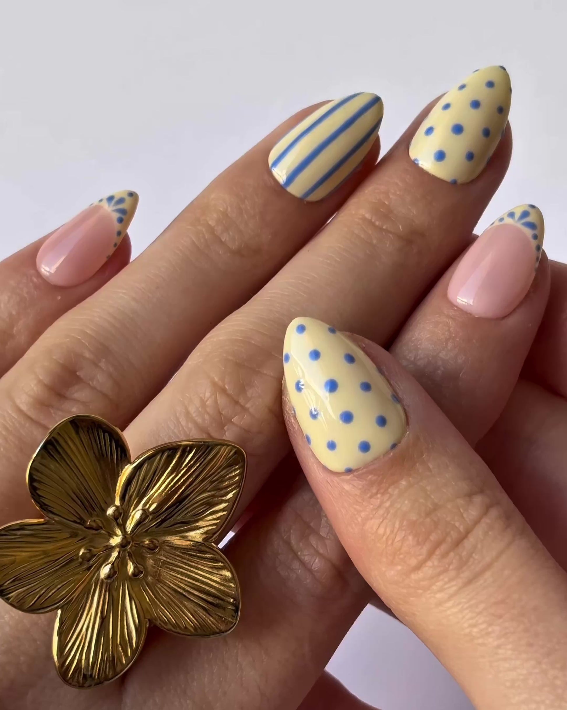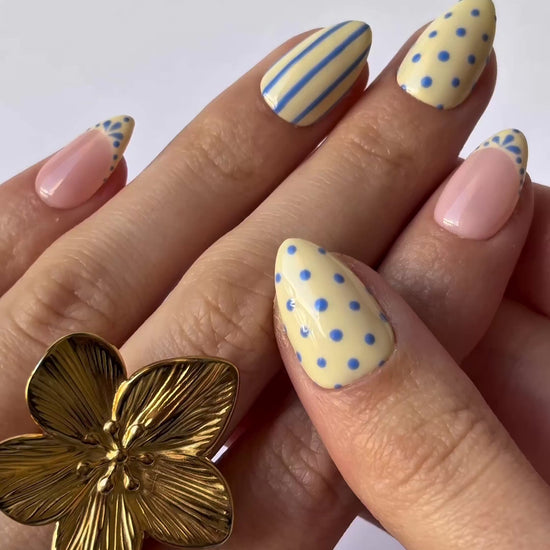 Un diseño fresco que mezcla amarillo y azul con una vibra mediterránea. Recuerda a días de sol, limonada fría y aire de primavera cerca del mar.
