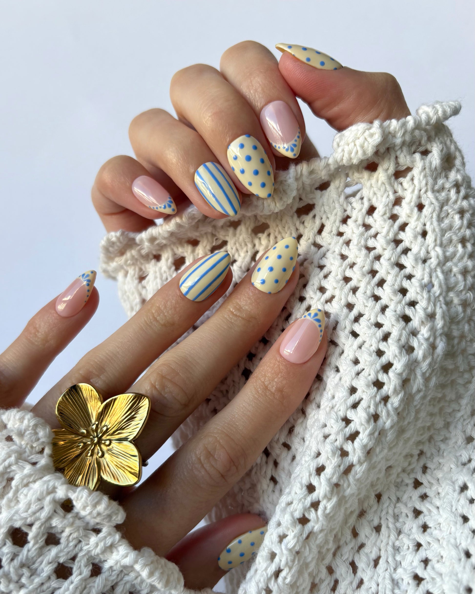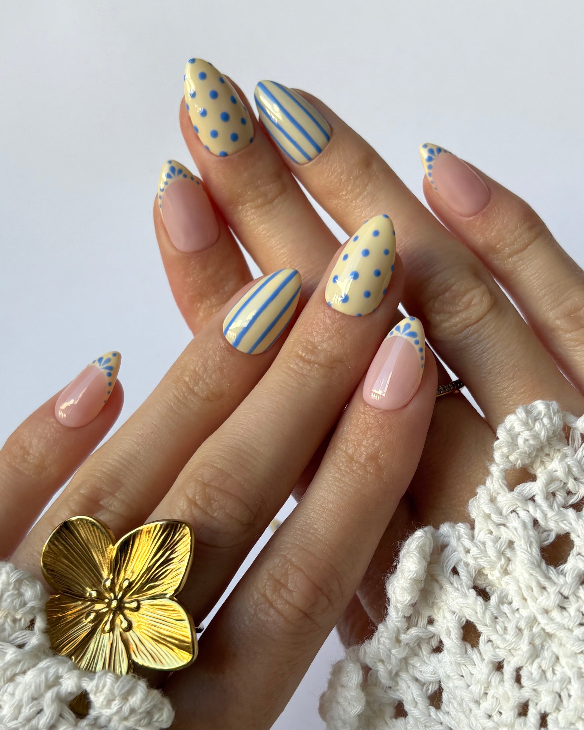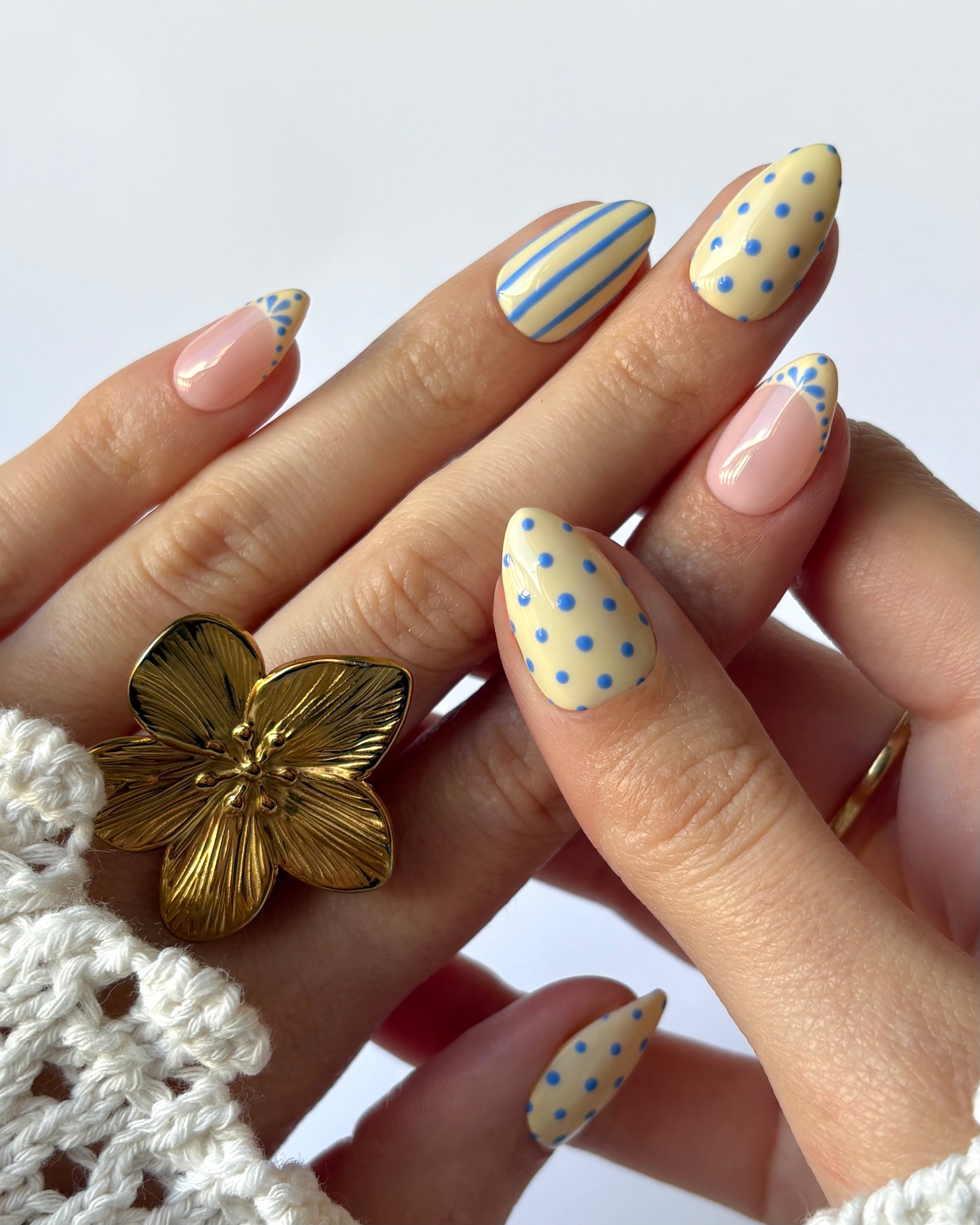 Un diseño fresco que mezcla amarillo y azul con una vibra mediterránea. Recuerda a días de sol, limonada fría y aire de primavera cerca del mar.