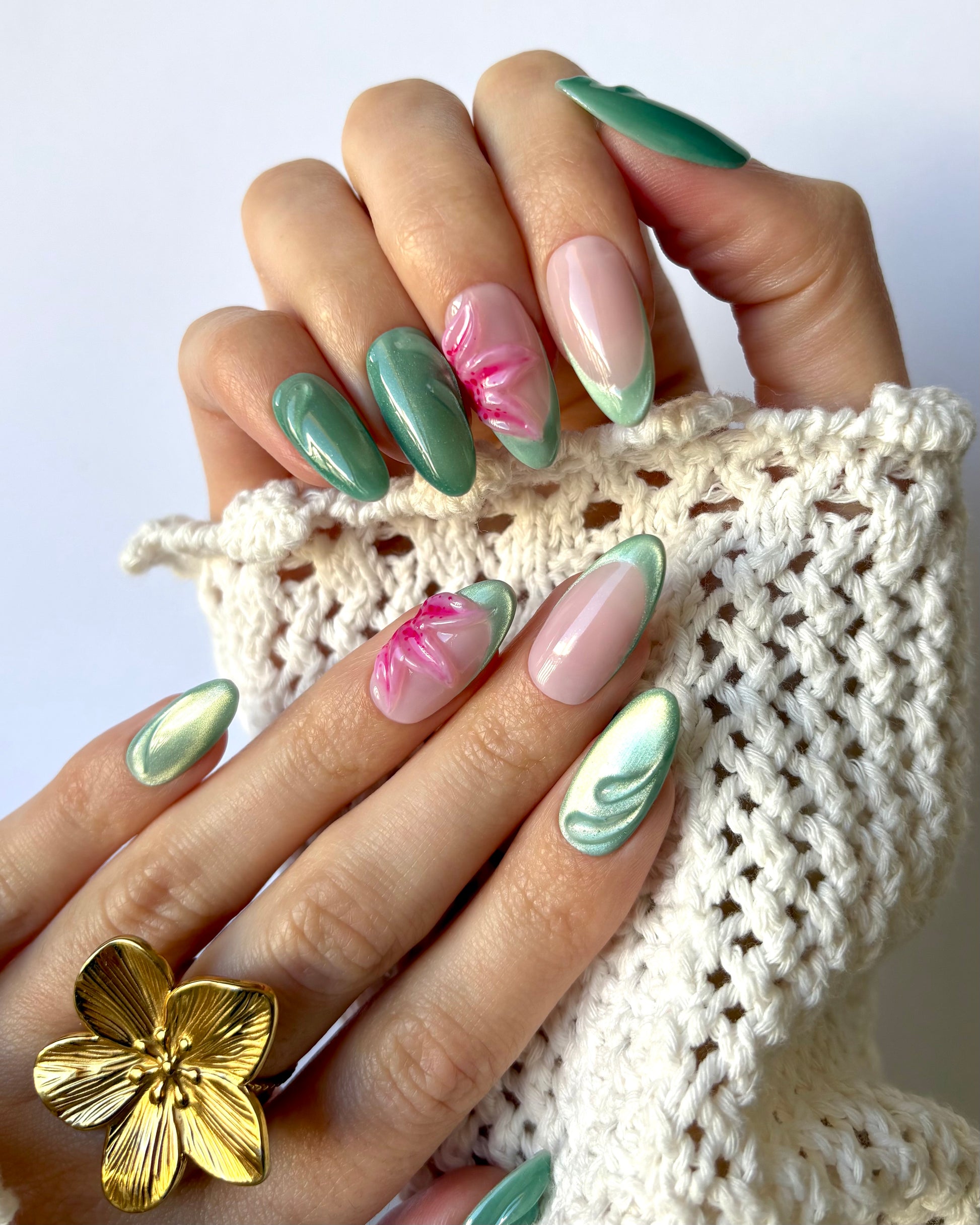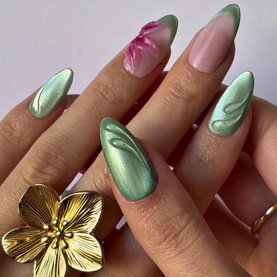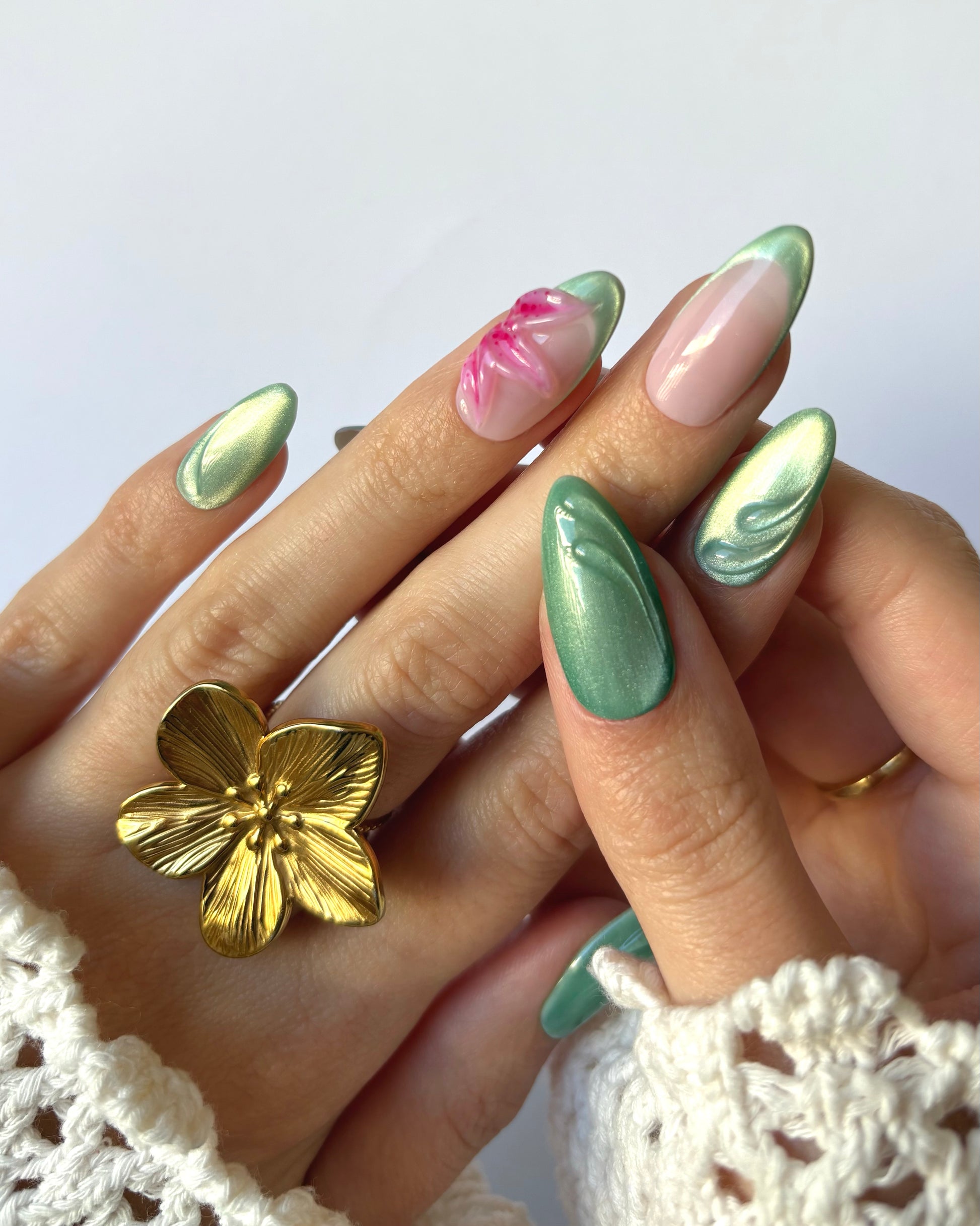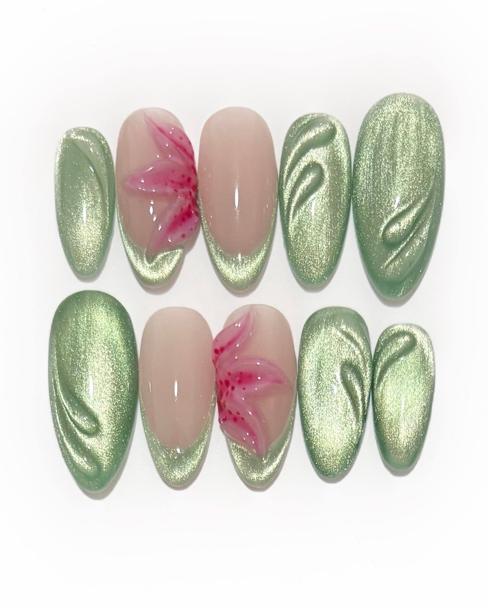 Un diseño que se siente como entrar en un pequeño jardín escondido en primavera. El verde cat eye cambia con la luz, como si el sol se colara entre las hojas, y la flor en relieve le da ese toque delicado y mágico.