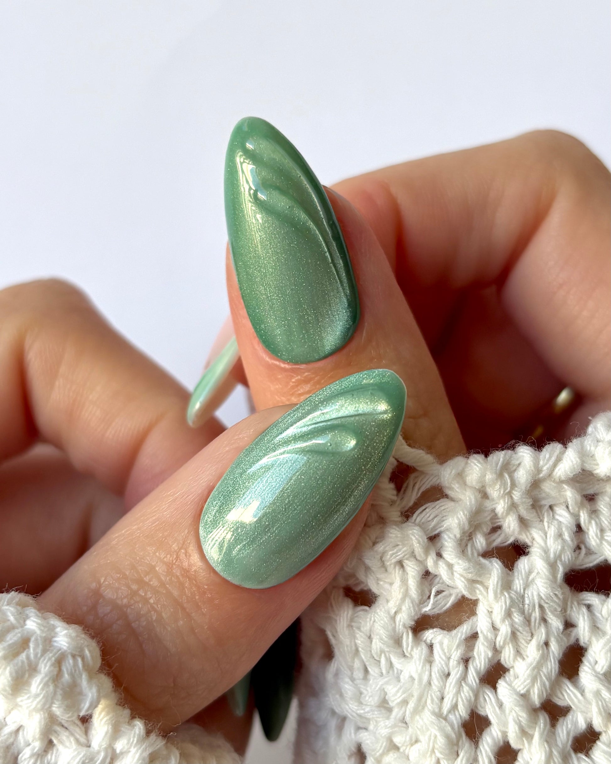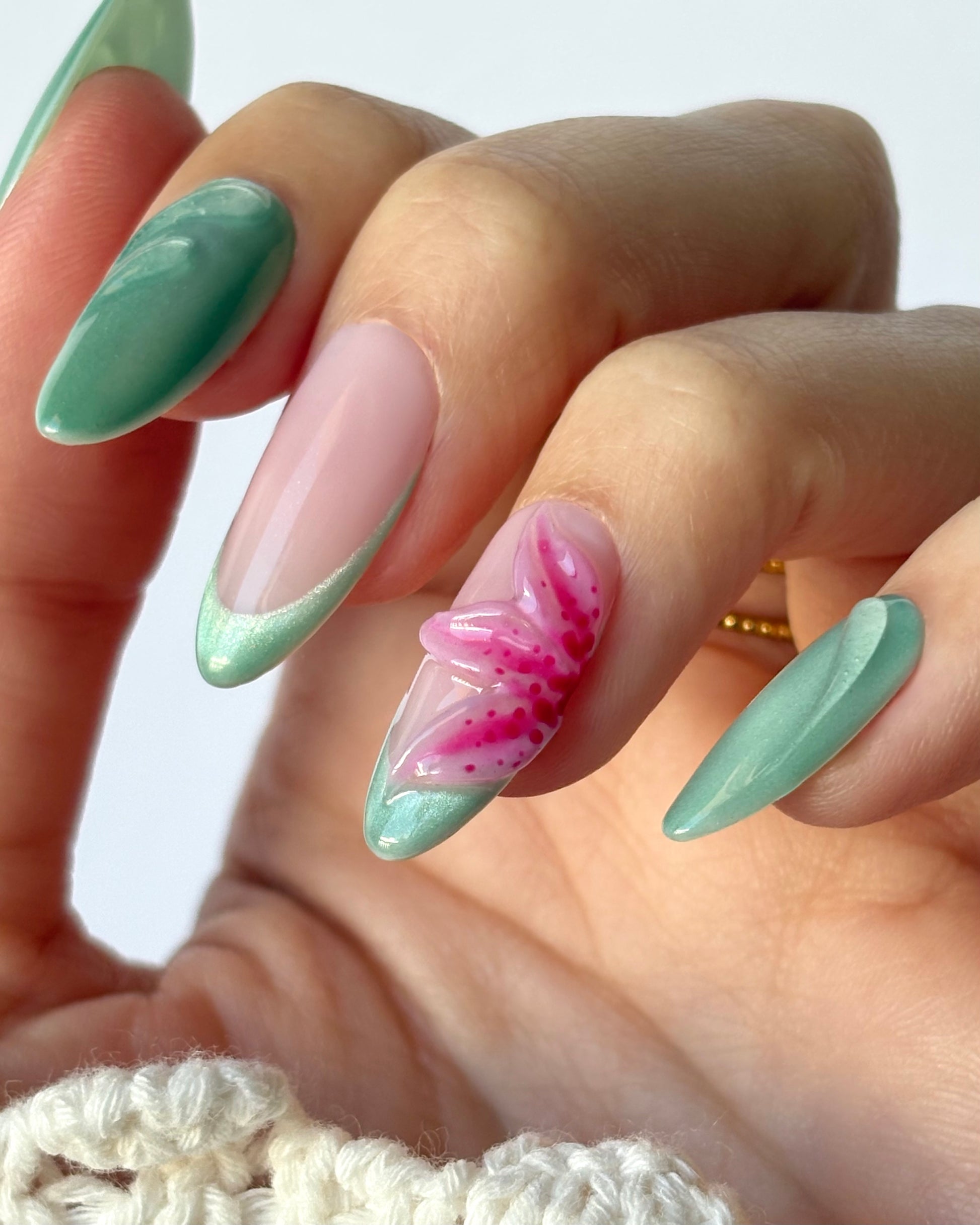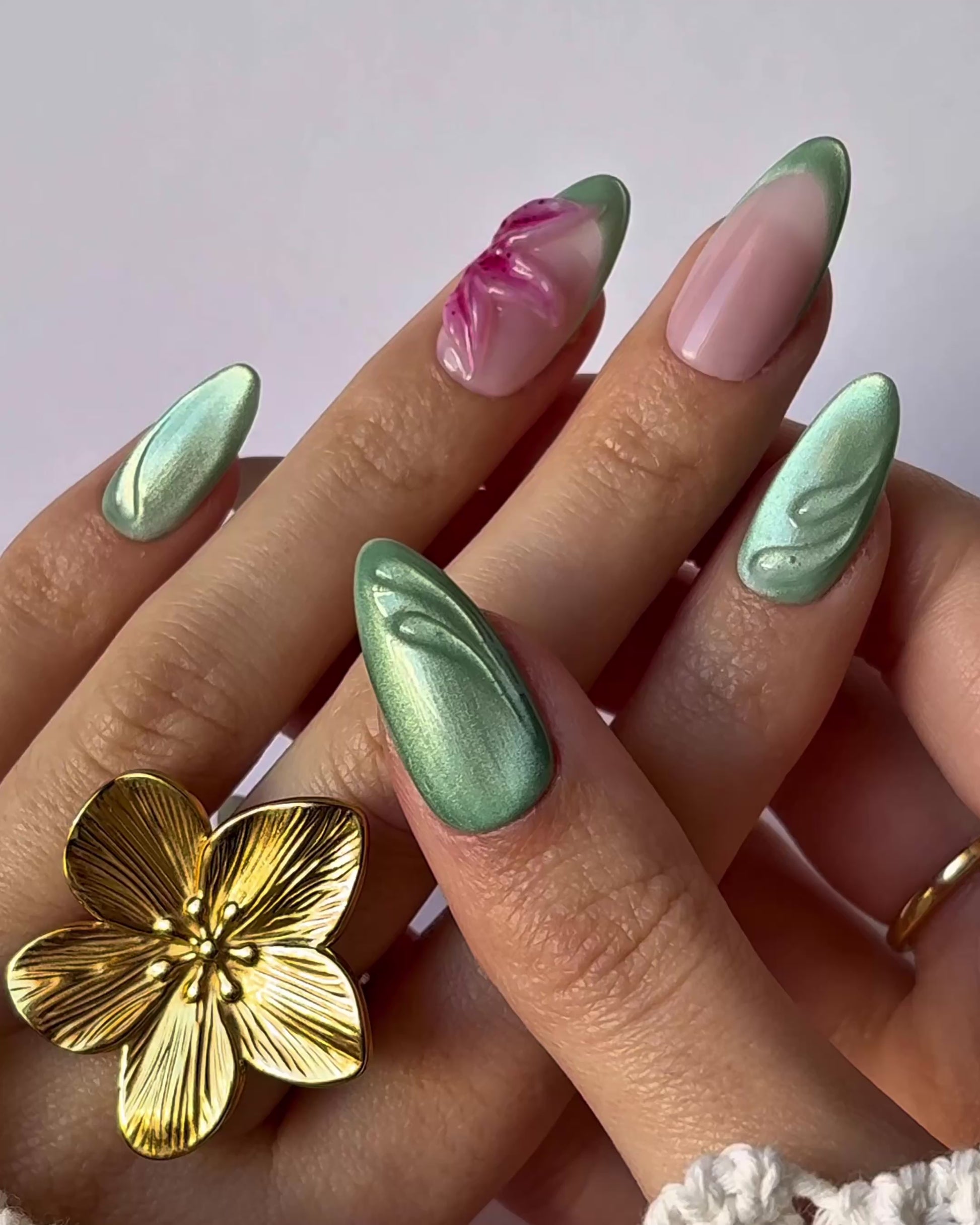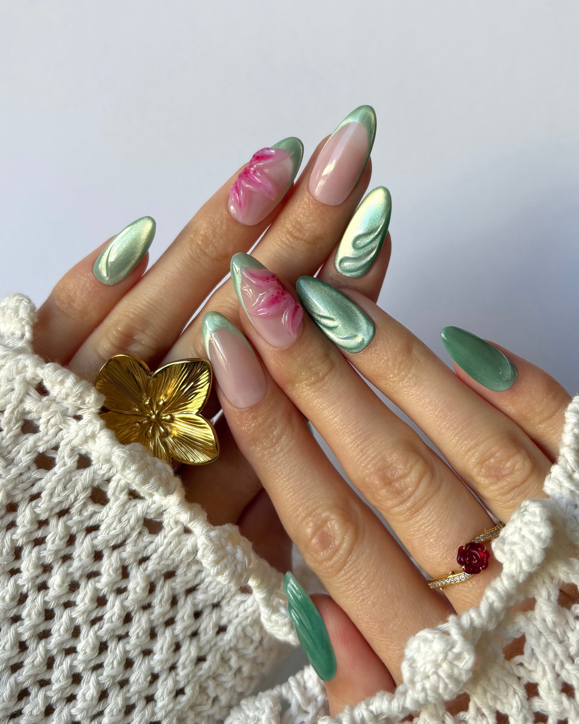 Un diseño que se siente como entrar en un pequeño jardín escondido en primavera. El verde cat eye cambia con la luz, como si el sol se colara entre las hojas, y la flor en relieve le da ese toque delicado y mágico.