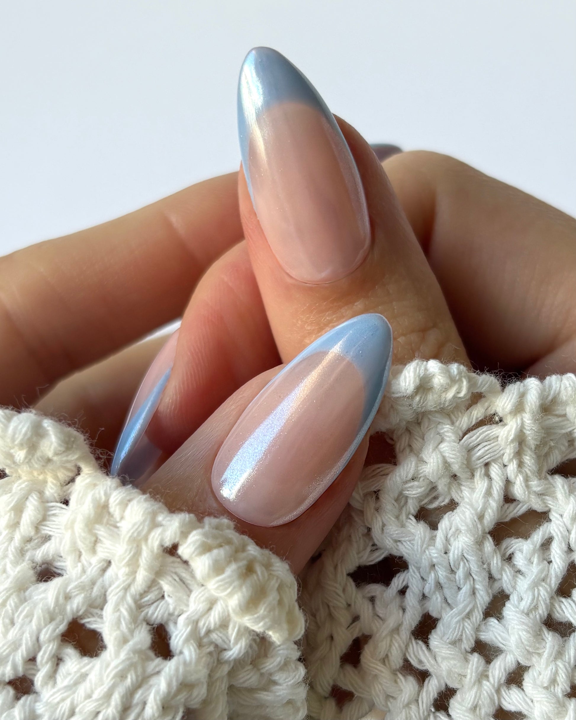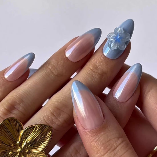 Un diseño suave y luminoso que recuerda a un cielo de primavera. La francesa en azul pastel, la flor en relieve y el efecto glazed aportan brillo y un acabado delicado lleno de luz.